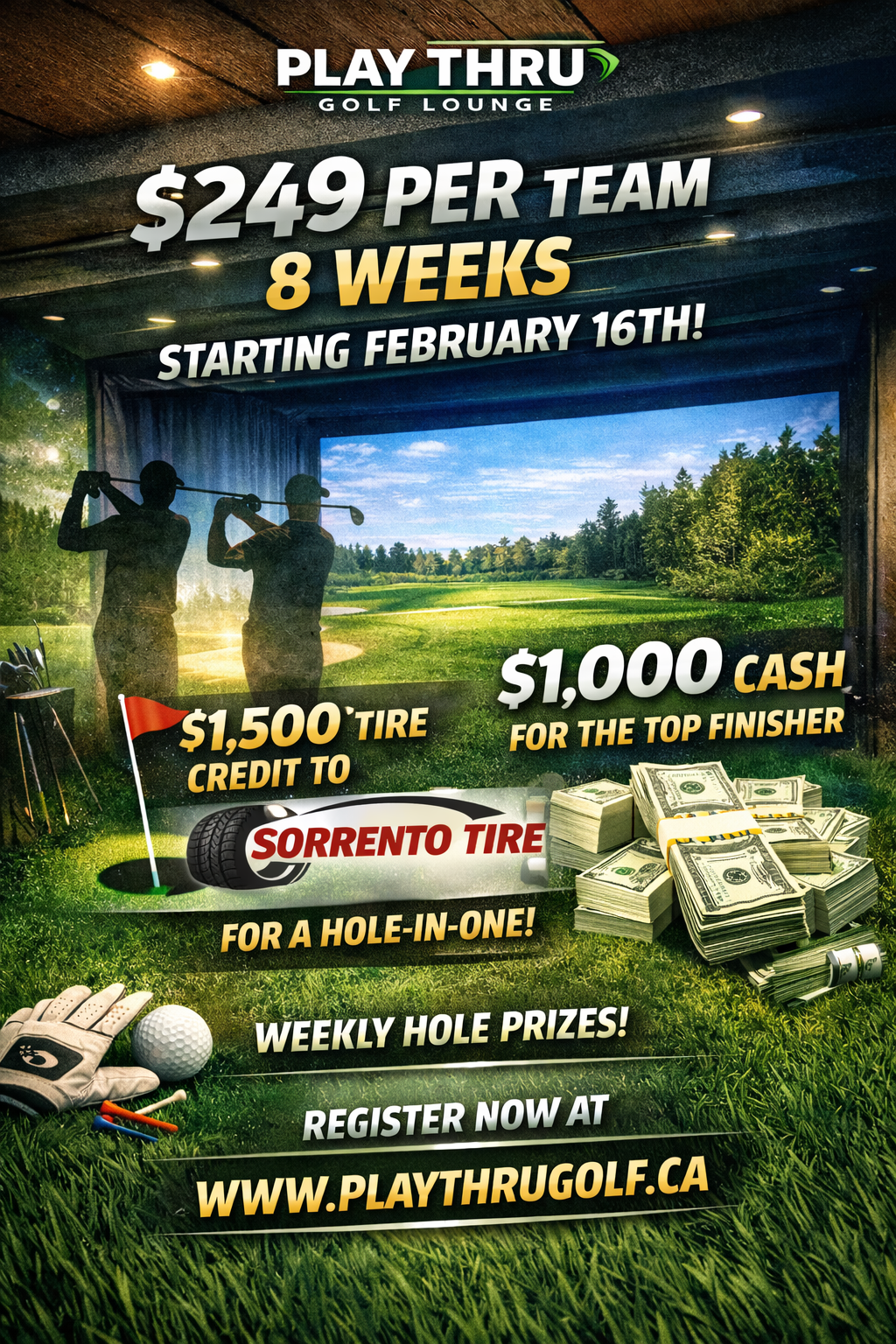 Join our 8-week, 2-Man Team League at Play Thru Golf Lounge, running Monday and Wednesday nights at 7:00 PM starting feb 16th, 2026. Each team registers for one night per week and competes in a season-long points race based on attendance and performance. Team games will be varied throughout the league.